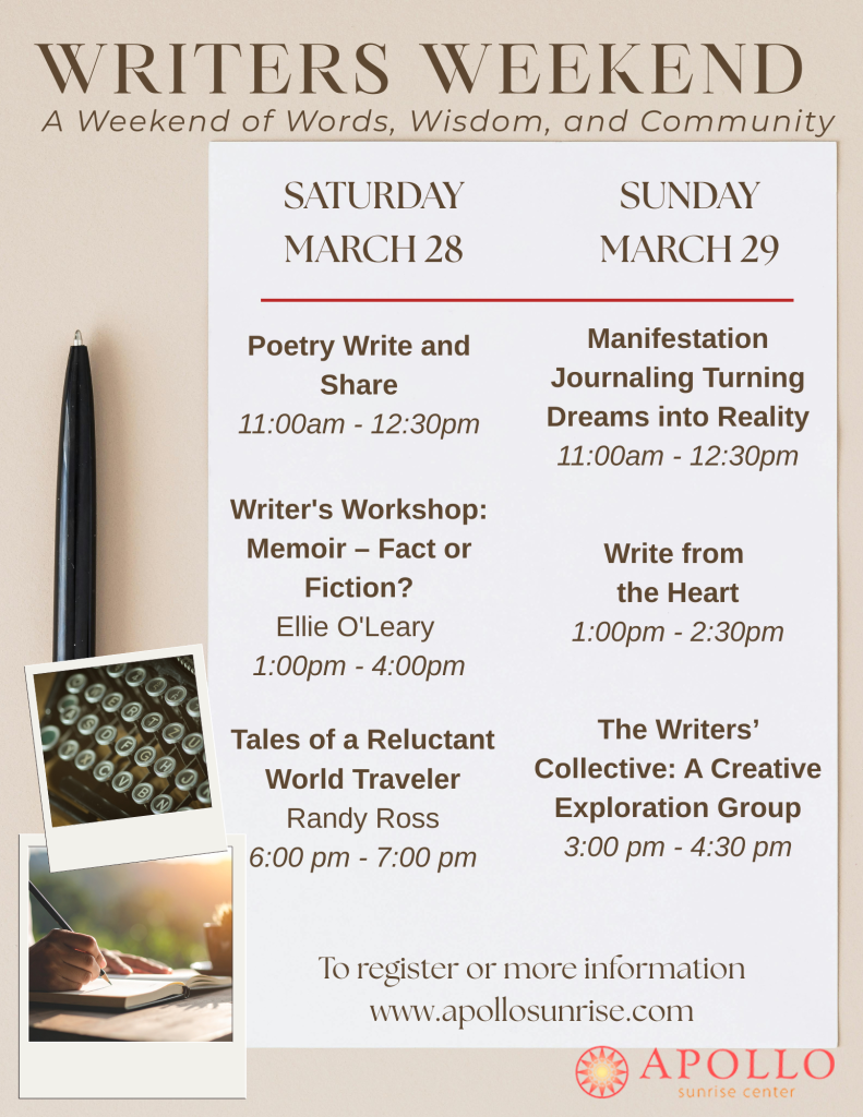 Throughout the weekend, we’ll offer six engaging workshops focused on memoir writing, poetry, storytelling craft, creative flow, and the realities of publishing. Attend one session or immerse yourself in the full weekend experience.